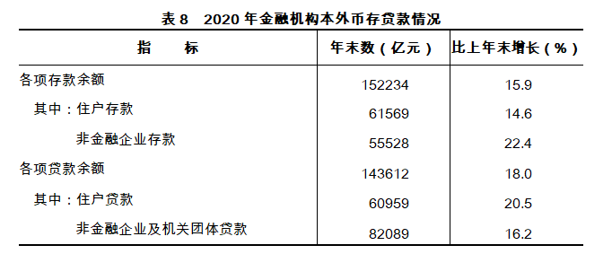 年末全部金融机构本外币各项存款余额152234亿元,比上年末增长15.9%,其中人民币存款余额增长15.1%。住户本外币存款余额61569亿元,增长14.6%。全部金融机构本外币各项贷款余额143612亿元,增长18.0%,其中人民币贷款余额增长18.2%。主要农村金融机构(农村信用社、农村合作银行、农村商业银行)人民币贷款余额20233亿元,比上年末增加3761亿元。