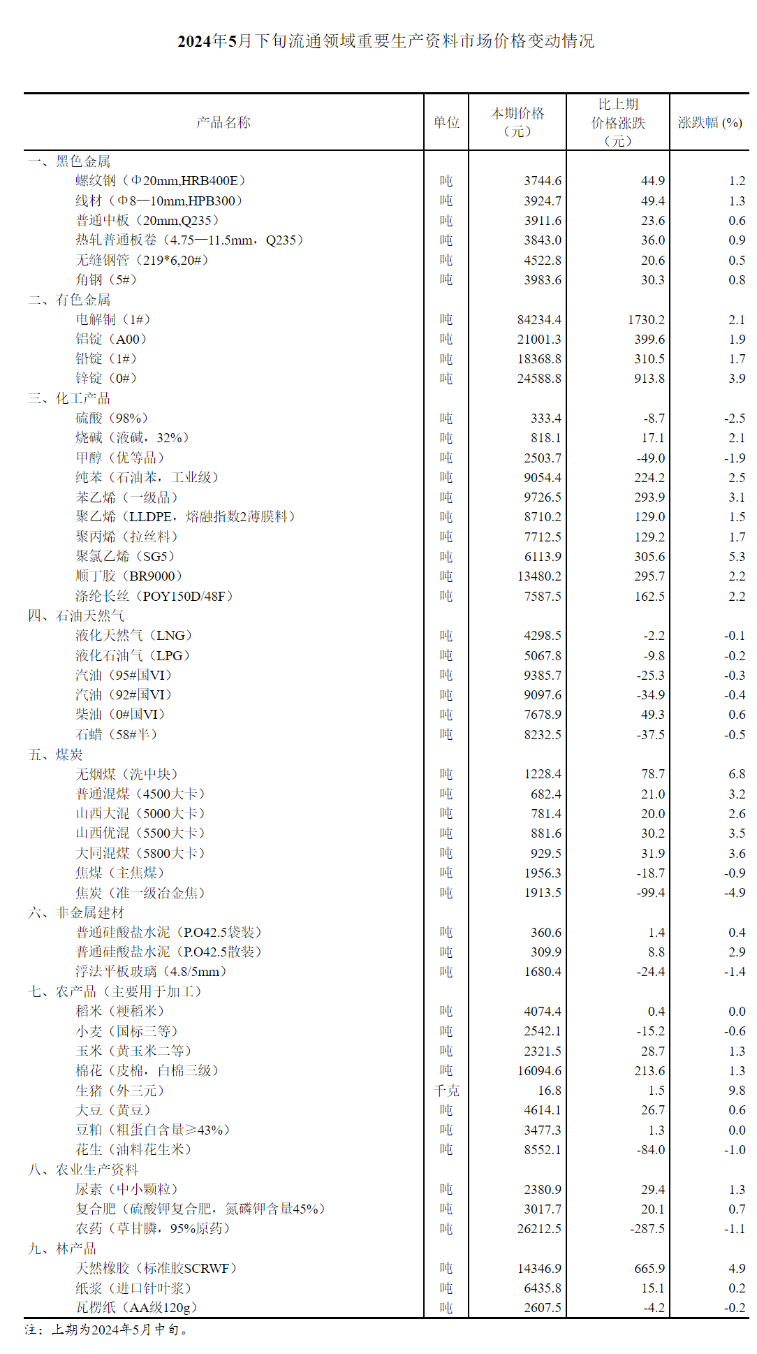 2024年5月下旬流通领域重要生产资料市场价格变动情况